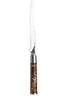 Het handvat is gemaakt van luxueus wortelhout, dat het mes niet alleen een verfijnde uitstraling geeft, maar ook zorgt voor een stevige, comfortabele grip. Een perfecte balans tussen functionaliteit en esthetiek.